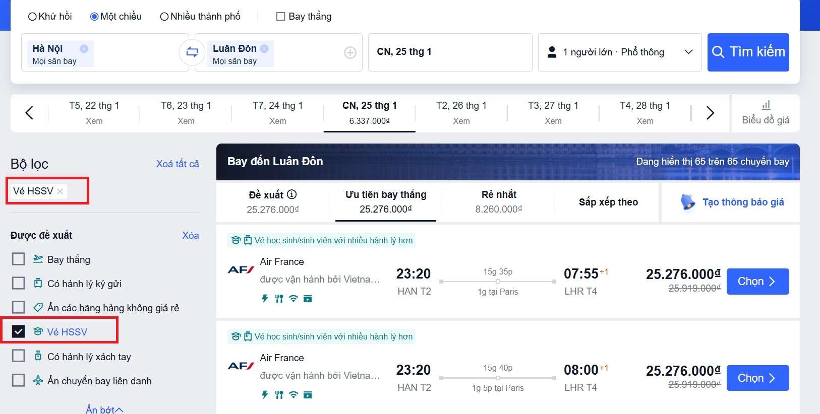 - Sử dụng bộ lọc "Vé Sinh Viên" khi tìm kiếm. Chọn chuyến bay có ghi "Vé HSSV"