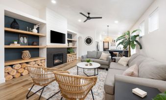 Just off the kitchen sits the cozy living room with calming decor & overhead windows that fill it with natural light. Two comfortable couches and a couple wicker chairs invite you to turn on the gas fireplace and curl up and relax with a good book or catch up on your favorite shows on the flat-screen 65” Roku Smart TV. Enjoy the speedy WiFi.