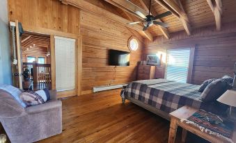 Upstairs is the great room with soaring ceilings and a wall of windows with breathtaking views. Enjoy the real mountain cabin feel! The living area features a 65" Smart TV where you can stream your favorite movies or shows. The great room also includes a dining area and a large kitchen - all with lots of natural light. There's a bedroom with ensuite bath on this level. The bedroom has a king bed and a full size futon and has big mountain views. A guest half bath is located on this floor, too.