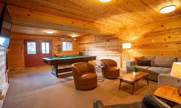 Head down to the lower level, where entertainment awaits! Our second living space features a pool table, board games, mini-fridge and more. There is a cozy lounge area with a big screen TV for family movie nights or watching the big game together. With easy access to the outdoors, it’s also a great spot for kids to play.