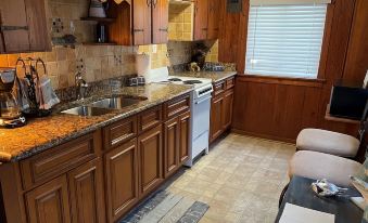 The cottage and outside washer and dryer, outside grilling area to sit and enjoy your meal.