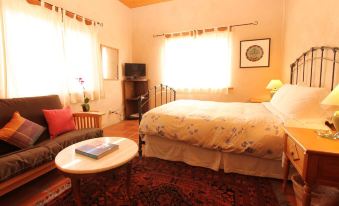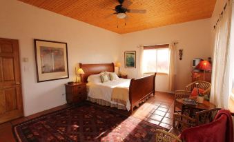 Our lovely home offers a spacious, master suite with a King bed, attached office/nursery, TV/DVD, a Jacuzzi bath, and walk-in closet & dressing area. The second bedroom, conveniently separated from the master by the common living space, comes with a queen bed & double futon, TV/DVD, and an amazing view of Taos Mtn. While the house can comfortably sleep four adults, it can easily accommodate two more on the sleeper sofa in the living room.
