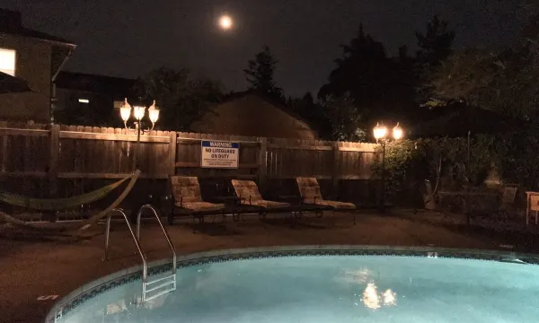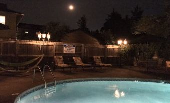 Spent a week at the Arden Forest Inn going to OSF performances. There is a nice Guest kitchen easy to access that is kept stocked w Kcups and a large frig where you can store your own milk and breakfast items. Our private patio made our stay wonderfully cozy. Pool was clean and refreshing. Very nice bed. We’ll be back.