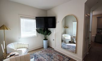 Located in the heart of Downtown Auburn, and only 1 block away from the Auburn University campus, this new 2BR Cottage offers you and your guests the highest comfort and convenience for your time on the Plains! Professionally designed and decorated, the Cottage is the perfect blend of contemporary elegance and southern charm with an open floor plan and gorgeous vaulted ceiling. The kitchen is fully stocked with quartz countertops and top-of-the-line LG appliances throughout, including full Washer & Dryer located off the kitchen. The bedrooms each provide a queen size bed and are connected by a beautiful bathroom including luxury tiled walk-in shower. The sleeper sofa (queen-size) provides space for 2 additional guests as well to sleep 6. The living room includes a 55" 4K SmartTV with complimentary YouTubeTV (plan includes most major sports channels).
