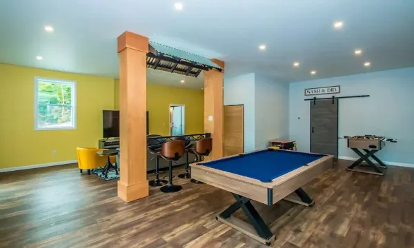 There are perfect spaces to gather in this open concept home including the great room with cathedral ceiling, gas fireplace, mountain views, 55" smart tv and comfortable seating; kitchen with SS appliances, granite countertops and plenty of seating; game room with foosball, pool table, video games, 75" smart tv, covered-bridge bar and sauna. There is also an outdoor hot tub patio, in addition to the deck that has both a fire pit and a grill. The house was built for comfort and fun and designed to be the perfect vacation home for gathering together or finding a quiet space to relax on your own.