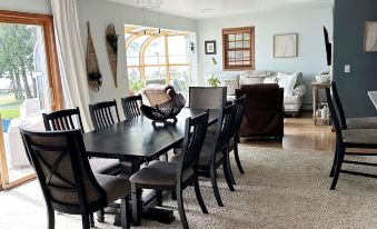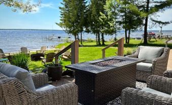 This five bedroom, four bathroom luxury home sets on 100 foot of private Sandy Beach. It’s fully stocked with everything you need for a great vacation summer,fall, winter or spring. Cross country skiing, fishing in the summer, winter, Black mountain trail riding with your off-road vehicles throughout the spring summer fall are all a short distance away. Bring your snowmobile‘s for great trail riding in the winter. Boat launch Access is close by to launch your boat or jet skis and they can easily anchored out in front during your stay by the private dock. Pontoon boat lift included for use if you bring or rent.