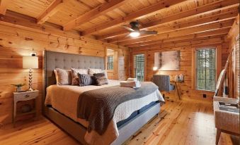 This spacious cabin has five bedrooms, including four suites. The 3rd floor master suite has vaulted ceilings, a king bed, a Smart TV, and an ensuite bathroom.