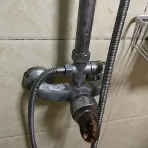 Buồng tắm vòi sen và vòi sen không sạch sẽ, chúng bám đầy vết cặn vôi. Không bao gồm chai nước.