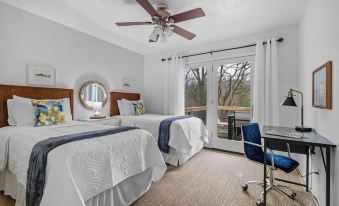 Across the house is the other upstairs bedroom and full bathroom. This bedroom has 2 cozy twin beds, a closet, and designated work station for anyone needing to clock in for a few hours while on vacation. The full bathroom for this bedroom is accessed from the hallway and has a beautiful tile tub/shower with shower soaps.