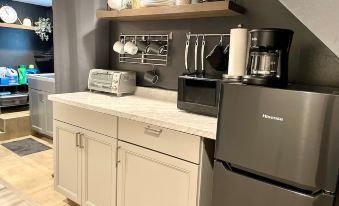 This beautifully renovated basement apartment with its modern chic décor has everything you need: a brand-new functional kitchenette, which includes a refrigerator, microwave, toaster oven, blender, coffee maker, toaster, and a two-burner hot plate for my creative chefs! Complimentary coffee, tea, & creamer will be provided.