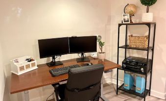 There is a designated office space for effortless remote work, which includes a large sit down/stand up desk, sturdy office chair, dual monitors you can connect to your laptop, and a wireless printer.