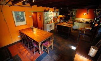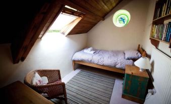Our place has been described as 'A little piece of paradise', and here you can feel the gentle tranquility of the Welsh countryside. It is perfect for children to safely explore and play. There is a large well equipped kitchen dining room downstairs, with a wood burning stove ( we supply you with firewood) and we provide breakfast goods including home laid eggs ( unless the hens are on strike!), teas, coffee, oils herbs and spices. Upstairs is a double bedroom, and a single bedroom (which can be set up with a comfortable camp bed or a cot for a second child or infant) plus bathroom. The double bedroom connects to a cosy sitting room, with single futon chairbed. There are a range of board games, books and toys. We are keen organic gardeners, so there are fresh herbs and in summer there are often salad vegetables available from the garden.