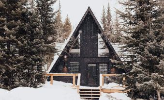 The top of the spiral staircase in the main living area opens up to a spacious, bohemian bedroom with two queen beds, an ensuite bathroom with a stall shower, and plenty of storage for clothing and luggage. Each queen bed is nestled in its own A-frame nook with a dimmable light fixture and extension cords for charging all your devices. This is our favorite place to rest after a long day of fun in the mountains!