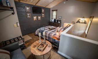 In the center of Bryson City lies your cozy one-bedroom HILLTOP Couple's Cabin! Ideal for your upcoming mountain retreat! As you step inside, you'll be greeted by a cozy queen bed with adjoining living room. Unwind and enjoy the convenient coffee bar and 50 in Roku TV. The fully stocked downstairs kitchenette is equipped with all the essentials, making it easy to prepare your favorite meals (please note no oven, dishwasher, or washing machine).