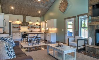 As you step inside, you'll be greeted by the contemporary allure of concrete floors that add a touch of sophistication to the farmhouse ambiance. The living area features a cozy fireplace, creating a warm and inviting atmosphere for those cooler evenings. Unwind on plush furnishings while enjoying the latest shows on the smart TV, or take in the picturesque pond view through windows that bring the outside beauty indoors.