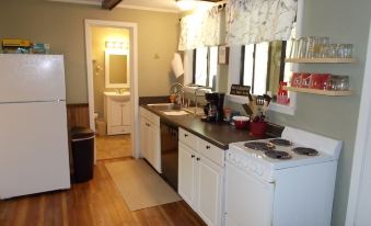 The cabin comes complete with oven and 4 burner stove, full sized fridge, microwave, toaster, dishwasher, complimentary in room coffee, TV (no cable/sat), DVD only player (there is a shared selection of DVDs, recommend you bring your own if you wish to watch TV), screened in upper deck,2 bedrooms, 3 queen beds, two bathrooms (1 with tub/shower and 1 with shower), fire ring, charcoal grill. There is limited Wi-Fi available on the property if it is needed.