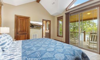 The main level features two private king suites, each complete with lake views and deck access, a flat-screen TV, a private en-suite bath, and a walk-in shower to freshen up.