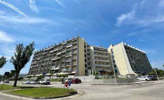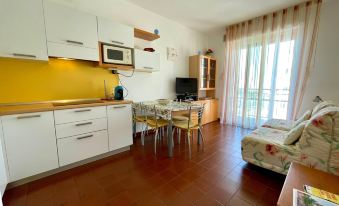 One-bedroom apartment for up to five guests, located on the 5th floor with lift, only 320mt from the beach. It is composed of a living room with two single sofa beds, an equipped kitchenette, a large bedroom with a double bed plus a single sofa-bed, a balcony, and a windowed bathroom with a shower box. It comes with a washing machine, and one covered parking spot. A/C is available at an additional cost (check below).