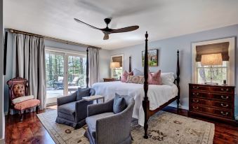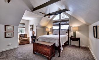 Downstairs has the Master bedroom and first guest bedroom. The Master is well appointed with a Smart TV and an inviting king sized four poster bed. You have your own access to the deck with sliding doors. Custom drapes frame a beautiful mountain view. The bathroom features two sinks with a vanity in between. Sit here and gaze out on to the garden while you get ready for the day. This bathroom has a soaking tub and a separate shower. The guest bedroom has a charming four poster double bed, desk, loveseat, and a window seat under the bay window. Also with a Smart TV. Private bath with shower/tub combination.