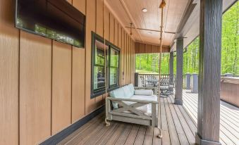 The sizable deck offers room to spread out as you enjoy the beautiful natural scenery that surrounds the lodge. This outdoor desk space includes seating, a TV, natural gas fire pit, and swinging bed.