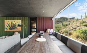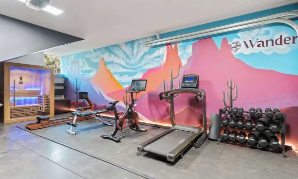 Wander Cave Creek has 3 bedrooms and 2.5 bathrooms and can comfortably house 6-8 guests. Amenities include a gym, sauna, fire pit, hot tub, AND cold tub to suit your needs for whichever desert weather you get. The smart home also comes equipped with high-speed wifi and 3 workstations complete with monitors, cameras and microphones. So, you don’t have to fully unplug to unwind!