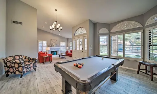 After a day in the sun, relax on the leather sectional couch in the living room and watch your favorite shows on the 75" flat-screen cable/smart TV. Challenge your travel companions to a game of 8-ball on the beautiful slate pool table adjacent to the living room.