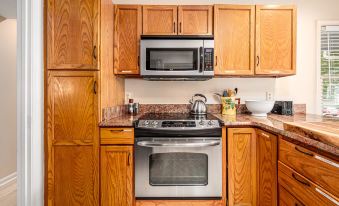 Our cottage boasts a warm and inviting ambiance, providing an ideal sanctuary for guests seeking a cozy home away from home. The well-appointed living area invites you to unwind and relax after a day of exploring Chapel Hill. Sink into plush furnishings while enjoying a good book or catching up on your favorite shows on the flat-screen TV.