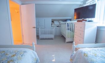 209 W. Hurlbut. Charlevoix Family Home - beautiful home, completely updated. One block into town, four blocks from Lake Michigan. Two thousand square feet. Three bedrooms upstairs (one king, one queen, one double and two twin beds). full size crib. Two full bathrooms - upstairs bathroom was completely remodeled in 2022!!! Two full bathrooms one upstairs and one downstairs. Double bed in fourth bedroom downstairs. Huge kitchen with island/bar stools and kitchen table that seats eight. Height chair. Two central air conditioners/furnaces- one on each floor. Two furnaces as well for winter stays.