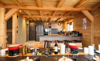 - A fully-equipped kitchen with American fridge with freezer, oven, induction hob, microwave, dishwasher, raclette, fondue and pierrade maker, electric kettle, toaster, filter coffee maker and NESPRESSO;