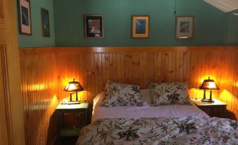 The bedroom is small yet delightful with queen bed, an antique dresser, closet and stained glass lamps.