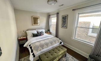 A large separate formal dining room has seating for 4, featuring a gallery wall of Chicago's most beloved architectural sites. The two spacious bedrooms have large windows, luxury Egyptian cotton bedding, and soothing decor. The full Art Deco- inspired bath is fully stocked with luxury towels and toiletries, and the gorgeous fresh kitchen boasts quartz countertops and new stainless steel appliances stocked with all the essentials to ensure you can create amazing meals.About pets:No pets allowed.About checkOut:Check out before 12:00 PM.About children:Children allowed: ages 3-17.About customRules:Absolutely no guests other than those included in the original booking may enter the property at any time during your stay..Quiet hours are observed from 10pm-8am. Our family resides in the downstairs unit, so this is strictly enforced.,Absolutely no gatherings or parties of any kind are allowed in the home..About checkIn:Check in after 3:00 PM.About smoking:Smoking is not permitted.About minBookingAge:Minimum age to rent: 21.About events:No events allowed.