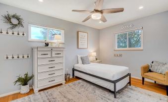 Second Bedroom, main level: Includes a single bed and a ceiling fan, perfect for solo relaxation.