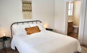 The large kitchen is a chef's dream. Tons of counter space, an induction range, espresso machine, coffee maker, dishwasher, and fridge with ice maker. The large quartz island seats 4 and up to 8 at the dining room table. There is also a half bath on the top floor so you don’t have to keep running up and down the stairs.
