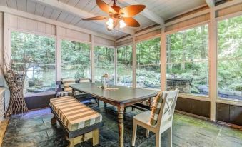 MAIN HOUSE: chefs kitchen, fully equipped with top appliances. There are 4 bedrooms in main house. 2 upstairs and 2 on the main floor, each floor has a bathroom. There is a full laundry room. The living room has two couches and a tv. This space also holds the indoor dinning room that can comfortably sit a large group. There is also an outdoor dinning room which is within a screened area which makes for outdoor dining without the bugs.