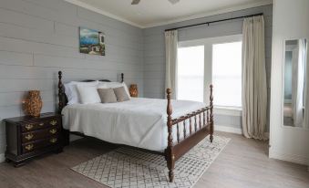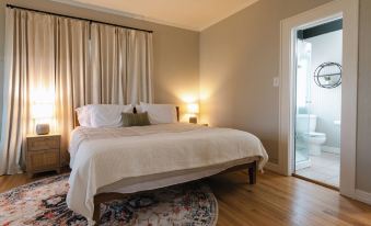 Unwind in the master bedroom, featuring a plush king bed and a private en-suite bathroom with a walk-in shower. The second bedroom offers a comfortable queen bed. For a spa-like experience, enjoy a relaxing soak in the separate bathroom's vintage clawfoot bathtub.