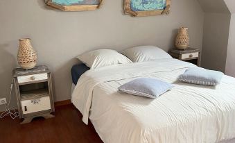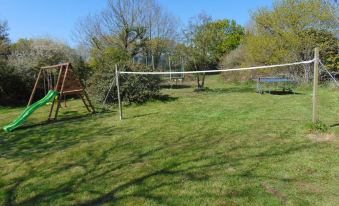 Penty Gwénaëlle accommodation for 4 people located on an area of 3 hectares of nature in the quiet countryside, with an outdoor playground (trampoline and badminton and volleyball), close to the ocean, beaches, coastal paths, shops, sports and cultural activities) ideal for a family with 2 children or two couples without children, consisting of a living room with dining room, a small kitchen with just enough, 1 wc on the ground floor, 2 rooms with bathroom and double beds.