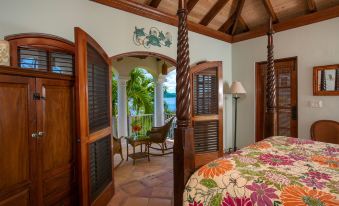 The Orchid Suite (master bedroom) has a four poster hand-carved king size bed, tiled bath with two vanities, an antique-style soaking tub and private outdoor shower. The balcony overlooks the pool with views of St. Thomas.