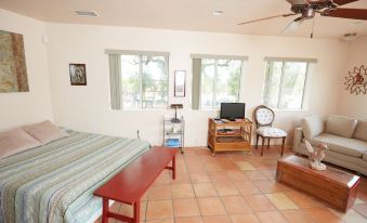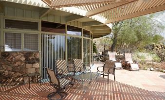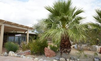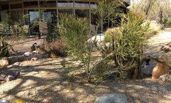Two large patios, barbecue, park like setting. 5 blocks to nearest hot springs. 5 minutes to a fitness center, 15 minutes to Palm Springs, 5 minutes to the famous Cabot Yerxes Lodge Museum, 45 minutes to Joshua Tree, 15 minutes to Bob Hope Casino, 35 minutes to the Outlets, 2 minutes to Golf course, 2 minutes to walking trails. 20 minutes to Pappy and Harriots in Pioneer Town.