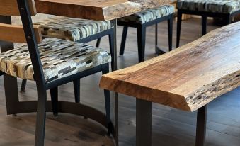 ~ Modern gourmet kitchen: Granite countertops, stainless steel appliances, and fully-stocked with everything you need for home-cooked meals + handcrafted live-edge dining table