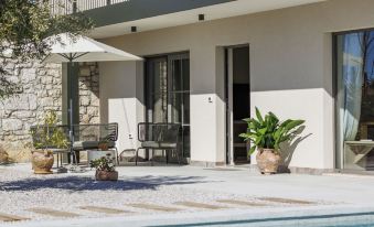 Very beautiful semi-detached house "Minda", 3 storeys, built in 2024. In the hamlet Dračevac, 8 km from the centre of Poreč, in a quiet, sunny position, 9 km from the sea. Private: property 580 m2 (fenced), swimming pool angular (8 x 4 m, depth 145 cm, seasonal availability: 01.May. - 31.Oct.). Outdoor shower, terrace (20 m2), garden furniture, barbecue, pool maintenance by the owner/gardener. In the house: internet access, sauna, washing machine. Parking (for 2 cars) at the house on the premises. Shop 3 km, supermarket 8 km, restaurant 3 km, bus stop 2.8 km. Please note: airfield 50 km from the property. 5-room semi-detached house 150 m2 on 3 levels. Beautiful and modern furnishings: living/dining room with open-hearth fireplace (only for decoration), satellite TV and air conditioning. Exit to the terrace, to the swimming pool. Open kitchen (oven, dishwasher, 4 ceramic glass hob hotplates, toaster, kettle, microwave, freezer, electric coffee machine). Sep. WC. Upper floor: 1 room with 1 french bed (180 cm, length 200 cm), shower/WC, satellite TV and air conditioning. Exit to the terrace. 1 room with 2 beds (90 cm, length 200 cm), shower/WC, satellite TV and air conditioning. Exit to the terrace. 2nd upper floor: 1 room with 1 french bed (180 cm, length 200 cm), shower/bidet/WC, satellite TV and air conditioning. Shower. Forced-air heating. Terrace 11 m2. Terrace furniture, deck chairs. Distant view of the sea. Facilities: safe, iron, mosquito net, hair dryer. Internet (WiFi, free).