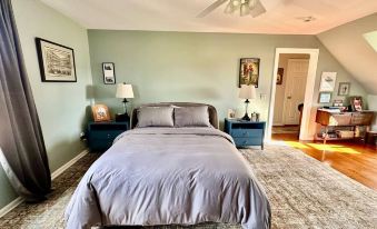 The primary bedroom suite offers a sunny bedroom, ensuite bathroom with freestanding claw-foot tub, double vanity, tiled shower, and a separate dressing / sitting room with fireplace, two walk-in closets, and a second set of stairs that lead down, offering convenient access to the kitchen and porch.
