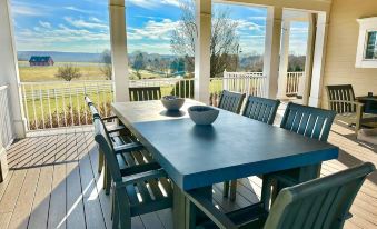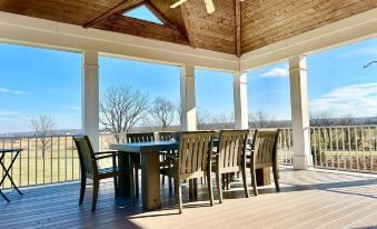 The eat-in-kitchen is a chef’s delight and features it's own fireplace, stainless steel appliances including a 6-burner Viking range, a second oven, granite counters, tile backsplash, center island, and access out to the expansive covered porch with vaulted ceiling overlooking sweeping views of the surrounding countryside and rolling hills. This is the perfect spot to enjoy your morning coffee, feel the breeze, and observe the local wildlife.