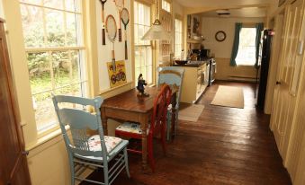 The home has original details throughout, including wide-plank wood floors, original glass in the windows, a dutch door in the kitchen leading out to a brick terrace, and traditional paint colors from the mid-1800's. Furnished with a mixture of some contemporary and many antique pieces that make it feel cozy and a step back in time. The views from almost every window are breathtaking - the wide Connecticut River to the front, and old-growth trees and limestone walls stretching up in the back to the cliffs above. Dishes, cookware, and silver are a combination of new and antique, with a blender, refrigerator in the eat-in kitchen, and a full size washer and dryer on the ground floor.