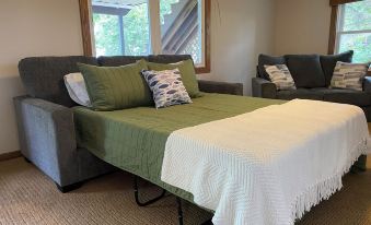 House layout: Lower level has a full bathroom with tub and shower, large bedroom with 2 queen beds and a full XL loft. The family room has a new queen sleeper sofa and gas fireplace. Stairs to the main floor. The main floor has a full bathroom with shower, gourmet kitchen, dining room, living room, and 1 bedroom with a queen bed. Stairs to the upstairs bedrooms. This has 2 bedrooms. 1 room has a queen bed overlooking the lake, the other room has 2 twin beds.