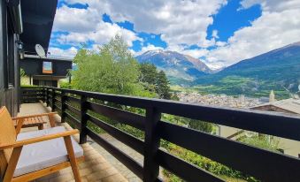 A beautiful view of the rooftops of Embrun and the surrounding mountains, with a south-facing exposure and beautiful light.