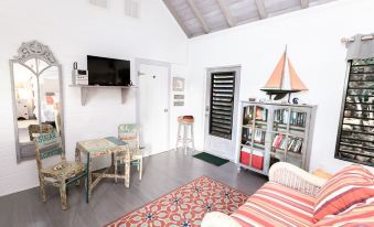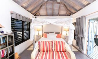 Stone steps from the center of the property's elevation lead to 3 self-contained guest cottages which are part of an Entire Property rental. From its spacious patio, charming K’ai Etoile offers arresting scenes of the beach which is right in front of the balcony. Its delightfully decorated environs include an air-conditioned bedroom, living room with sleeper sofa for additional guests and fully-equipped kitchen.
