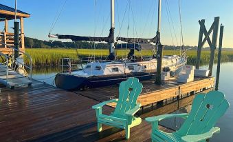 The Yacht is on a very secluded dock just off the Folly River. This paradise is all yours for your entire stay. You can relax in the hammock or sit at the picnic table on the large pierhead overlooking the marsh. You can take one of the kayaks (we have 2 singles and 1 double) and paddle through the marsh exploring, go swimming, or try your luck fishing or crabbing from the dock. You can also enjoy a breathtaking sunrise and sunset - relax in the chairs on the dock, or up on the pierhead where you will always find a cool breeze.