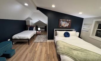 On the first floor, there’s a bedroom specifically designed for guests who prefer to avoid stairs. This room features a trundle/bunk bed setup with a full-size bed and two twin beds, providing flexible sleeping arrangements for all.
