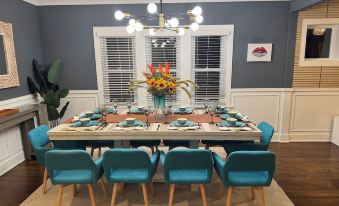 The living areas of the home exude elegance, with hardwood floors and stylish décor throughout. The living room is designed for relaxation, featuring three comfortable couches (two of which converts into a futon for additional sleeping space) and a 50-inch TV, making it ideal for movie nights or cozy gatherings. The dining area boasts a well-appointed 10-person table, perfect for family meals, elegant dinners, and memorable evenings together.