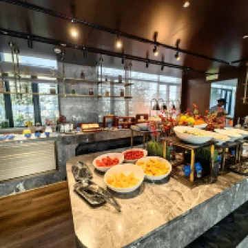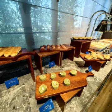 Bữa sáng nằm trên tầng cao nhất, view đẹp và đa dạng, giống như một nhà hàng chuyên phục vụ trà sáng.